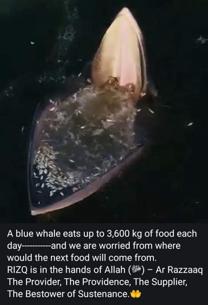 নিজ রিজিক(RIZQ) নিয়ে যারা দূঃশ্চিন্তাগ্রস্থ, তাদের একবার বিরাটাকায় নীল তিমির খাদ্যের সরবরাহ পদ্ধতির কথা ভাবা উচিৎ; কোন কোন নীল তিমি ৩৬০০ কেজির ও অধিক খাদ্য একদিনে খেয়ে ফেলে… অথচ এমন হাজার হাজার নীল তিমি সমূদ্রে নিশ্চিন্তে দিনাতিপাত করছে, আর সৃষ্টির সেরা জীব হয়ে আপনি হতাশ-বিষন্ন চিন্তিত; কি ভাবে দুটো অন্ন যোগাড় হবে? নিশ্চয়ই আপনার আস্থা ও বিশ্বাসে (Tawakkol) এবং পরিশ্রমে বিশাল ঘাটতি রয়েছে –